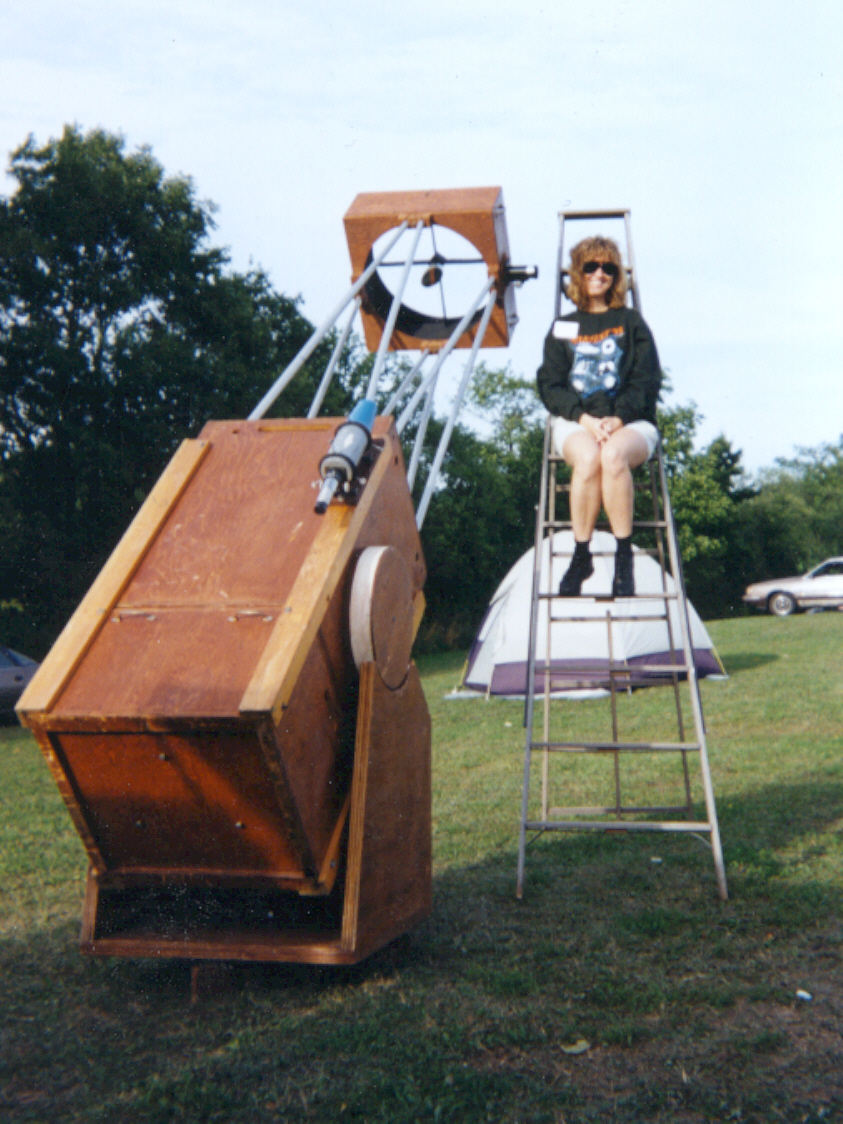 In 1986, a group of Columbus, Ohio amateurs banded together and purchased the scope from Marshal. We rebuilt the scope into a half wood/half truss tube dobsonian in 1987. This version of the scope traveled to Astrofest where it won an award for a computer pointing system installed on it by group member Bill Burton. It also traveled to Stellafane in 1987 where John Dobson himself commented on its longer-then-normal focal ratio. The scope was stored at Warren Rupp Observatory for several years and used from time to time.